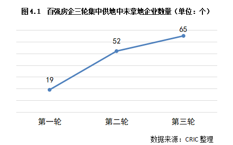 在首輪集中供地時僅有19家房企未拿地,而不拿地的房企數(shù)量在第二、三輪集中供地時,飆升至52家和65家,還在拿地的房企反而成為少數(shù)。