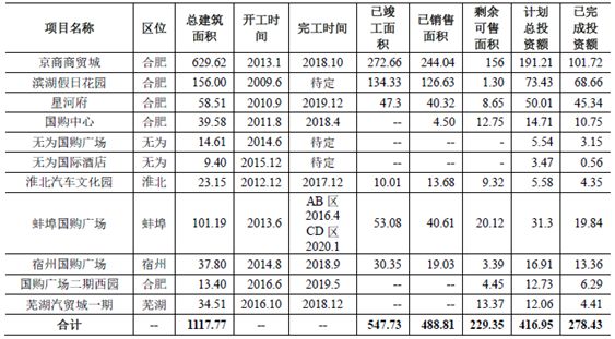 除去司爾特的4.45億存貨外,公司存貨約有121億,主要是開(kāi)發(fā)成本和開(kāi)發(fā)產(chǎn)品,但其實(shí)很難從公司的年報(bào)和評(píng)級(jí)報(bào)告中把存貨細(xì)項(xiàng)直接核對(duì)出來(lái)。從在建地產(chǎn)項(xiàng)目來(lái)看,投入金額總和為278億,遠(yuǎn)大于121億的存貨金額,說(shuō)明公司公布的在建項(xiàng)目里面有部分其實(shí)已經(jīng)結(jié)轉(zhuǎn)了;金額最大的幾個(gè)項(xiàng)目是合肥京商商貿(mào)城、濱湖假日花園、星河府和合肥國(guó)購(gòu)中心;然而在17年9月底時(shí),公司經(jīng)營(yíng)性物業(yè)面積最大的就是合肥京商商貿(mào)城和合肥國(guó)購(gòu)中心,而且這兩項(xiàng)目都還處于招商中,說(shuō)明公司的業(yè)績(jī)嚴(yán)重依賴于兩三個(gè)在開(kāi)發(fā)以及已建成但還未運(yùn)營(yíng)的項(xiàng)目-合肥京商商貿(mào)城、合肥國(guó)購(gòu)中心和星河府。這三個(gè)項(xiàng)目中,除了星河府有部分住宅外,其它基本都是商辦和公寓酒店這類去化非常慢的項(xiàng)目,所以有地產(chǎn)開(kāi)發(fā)界人士曾告訴筆者國(guó)購(gòu)是死于商業(yè)地產(chǎn)也不無(wú)道理。