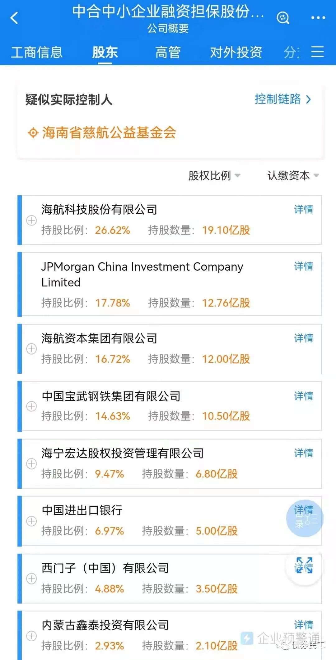 中合擔(dān)保成立于2012年,股東海航科技股份有限公司、海航資本集團(tuán)有限公司、中國寶武鋼鐵集團(tuán)有限公司和中國進(jìn)出口銀行等。