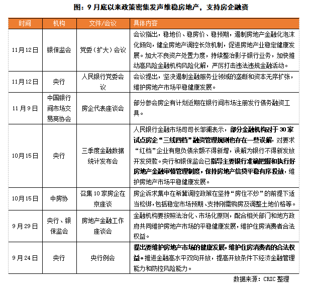 9月末央行首次提及“兩個(gè)維護(hù)”,指導(dǎo)銀行準(zhǔn)確把握和執(zhí)行好房地產(chǎn)金融審慎管理制度,保持房地產(chǎn)信貸平穩(wěn)有序投放,維護(hù)房地產(chǎn)市場(chǎng)平穩(wěn)健康發(fā)展。10月15日,中房協(xié)召集了10家房企在京座談,住建部相關(guān)部門人員參與主持,據(jù)透露,房企的主要訴求集中在希冀調(diào)控政策在堅(jiān)持“房住不炒”的前提下適當(dāng)松綁,包括穩(wěn)定市場(chǎng)預(yù)期、支持剛需購房及調(diào)整土地價(jià)格等。此后,央行和銀保監(jiān)會(huì)又多次提及促進(jìn)房地產(chǎn)行業(yè)穩(wěn)定健康發(fā)展。在此情況下,政策端風(fēng)向有所緩和,從宏觀上對(duì)房地產(chǎn)信心重塑有所推進(jìn),維穩(wěn)房地產(chǎn)。