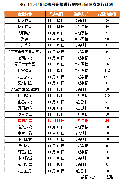 銀行間商協(xié)會(huì)座談會(huì)后,眾多房企密集發(fā)行中期票據(jù)和超短融資券。11月10日,常州城建、北京住總、小商品城宣布擬發(fā)行超短融資券,鎮(zhèn)江城建公告擬發(fā)行4億元的中期票據(jù);到11月11日,保利發(fā)展宣布擬發(fā)行20億元的中期票據(jù),將銀行間債券市場(chǎng)的融資主體從城投擴(kuò)展到主流房企,而后11月12日,光明地產(chǎn)宣布擬發(fā)行5億元中期票據(jù),招商蛇口公告擬分別發(fā)行30億元的中期票據(jù)和超短融,企業(yè)融資“冰凍”狀態(tài)有所緩解。