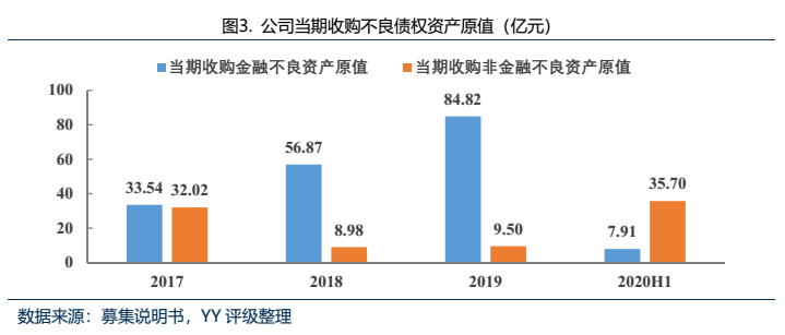 來(lái)自非金融企業(yè)的不良資產(chǎn)項(xiàng)目截至2020年6月末共10個(gè),比2019年末新增了4個(gè)項(xiàng)目。2020年上半年,受疫情影響,公司非金融類(lèi)企業(yè)不良債權(quán)收購(gòu)規(guī)模大幅增加,原值為35.70億元;一方面經(jīng)濟(jì)下行使得不良資產(chǎn)的供給增加、收購(gòu)成本降低,但另一方面需關(guān)注債務(wù)人信用風(fēng)險(xiǎn)的上升對(duì)不良資產(chǎn)回收金額和時(shí)間不確定性的影響。
