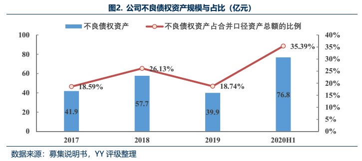 截至2020年6月末,公司凈資產(chǎn)規(guī)模為45.82億元。營(yíng)業(yè)凈收入主要來(lái)自債權(quán)投資收益。隨著公司逐步回歸主業(yè),不良資產(chǎn)處置收益占比增加。公司資產(chǎn)負(fù)債率為78.87%, 2021年面臨債券集中兌付壓力,賬面貨幣資金對(duì)短期有息債務(wù)的覆蓋率約40%,較為一般。考慮到公司交易性金融資產(chǎn)和債權(quán)投資的可變現(xiàn)性、未使用授信余額,如果不出現(xiàn)較大的股東震蕩可能仍有一定的救助價(jià)值,但是因?yàn)槿A融、賴(lài)小民、眾多的垃圾資產(chǎn),可能內(nèi)控形同虛設(shè),部分人需要繼續(xù)追擊刑事責(zé)任,可能潛在的窟窿仍需要事件定性后才能真正解決,目前可能處于處理期。