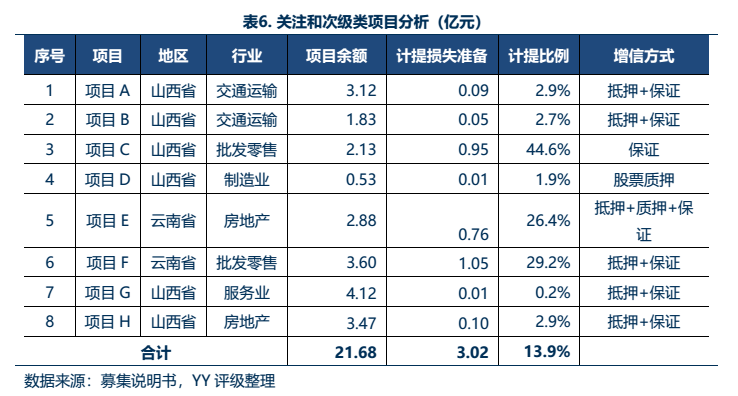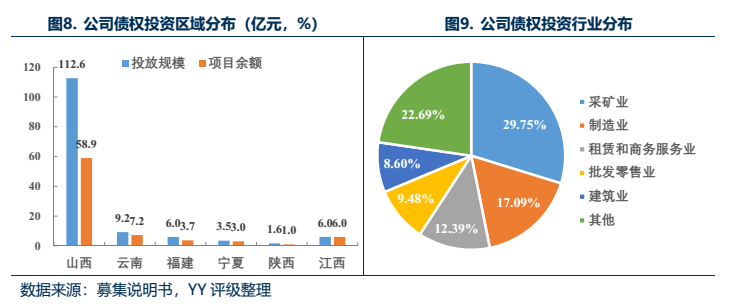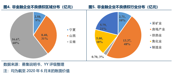 不良資產(chǎn)底層債務(wù)人來(lái)看,存量非金融項(xiàng)目主要涉及采礦業(yè)、制造業(yè)和房地產(chǎn)業(yè),其中8個(gè)項(xiàng)目的底層債務(wù)人為民企;約48%投向了房地產(chǎn)業(yè);區(qū)域分布于山西、云南和寧夏地區(qū),云南地區(qū)占比60%。