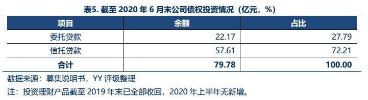 公司債權(quán)投資業(yè)務(wù)主要包括發(fā)放委托貸款、信托貸款以及少量閑置資金用于投資理財(cái)產(chǎn)品,投放的貸款期限平均為2-3年;截至2020年6月末余額為79.78億元。受資管新規(guī)影響,公司的債權(quán)投資業(yè)務(wù)比重自2018年起逐年降低,且更多地通過(guò)信托渠道進(jìn)行,目前收入主要依靠存量項(xiàng)目。