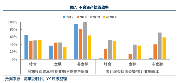 處置效率上,公司來(lái)自金融機(jī)構(gòu)不良債權(quán)資產(chǎn)的當(dāng)期收購(gòu)折扣率約4折,非金融企業(yè)債權(quán)折扣率8折左右,部分收購(gòu)為原值收購(gòu)。截至2020年6月末,公司非金融不良債權(quán)累計(jì)收購(gòu)折扣率為81.25%,累計(jì)現(xiàn)金回收率58.66%,收購(gòu)成本較高;來(lái)自金融機(jī)構(gòu)不良債權(quán)的收購(gòu)成本不高,處置進(jìn)度一般,整體收購(gòu)成本偏高,不排除輸血嫌疑。