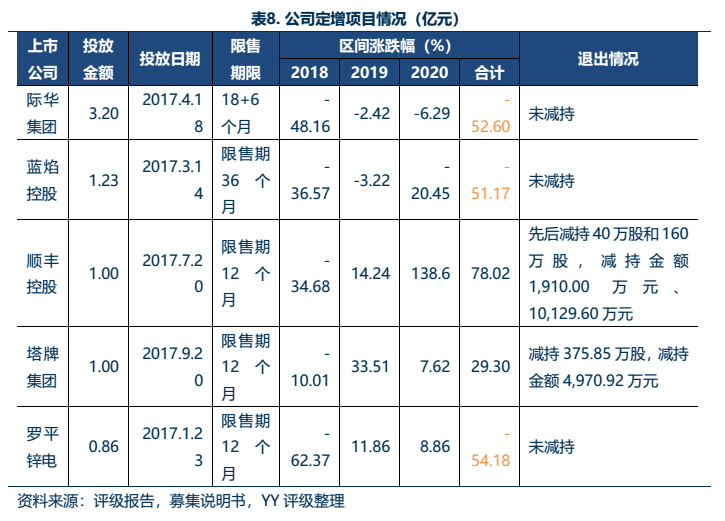 可以看出,除了順豐控股和塔牌集團(tuán)的股票價(jià)格走勢(shì)較好之外,其他幾家2018-2020年的累計(jì)跌幅均超過(guò)了50%,股票價(jià)格低于定增價(jià)格。總體而言,公司投放的股票定增項(xiàng)目表現(xiàn)平平,累計(jì)收益情況不佳,后續(xù)退出情況需關(guān)注股票市場(chǎng)走勢(shì)。