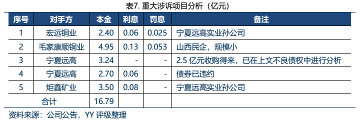 具體來(lái)看,項(xiàng)目1、3、4、5均與寧夏遠(yuǎn)高實(shí)業(yè)有關(guān)。2020年11月23日,寧夏遠(yuǎn)高的“18遠(yuǎn)高01”發(fā)生實(shí)質(zhì)性違約,此前寧夏遠(yuǎn)高已申請(qǐng)破產(chǎn)重整。在這一背景下,公司贏得訴訟之后,也將面臨著回款周期長(zhǎng)、與多個(gè)金融機(jī)構(gòu)共同追債等困難情況,執(zhí)行難度大。考慮到均有抵質(zhì)押物等增信,保守估計(jì)清償率按30%的情況下,這5個(gè)重大涉訴項(xiàng)目將導(dǎo)致約11億元的損失。