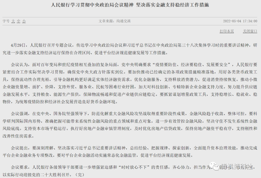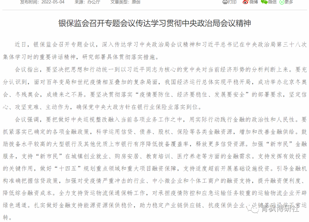 一、5月4日,金融管理部門齊發(fā)聲,公布4月29日政治局會議(參見剛剛,429政治局會議釋放了哪些重大信號?)的學(xué)習(xí)新聞稿,雖然沒有太多增量信息,但穩(wěn)預(yù)期的信號卻比較明顯。之所以選擇在這一天齊刷刷公布新聞稿,理由其實很簡單,主要有兩個: