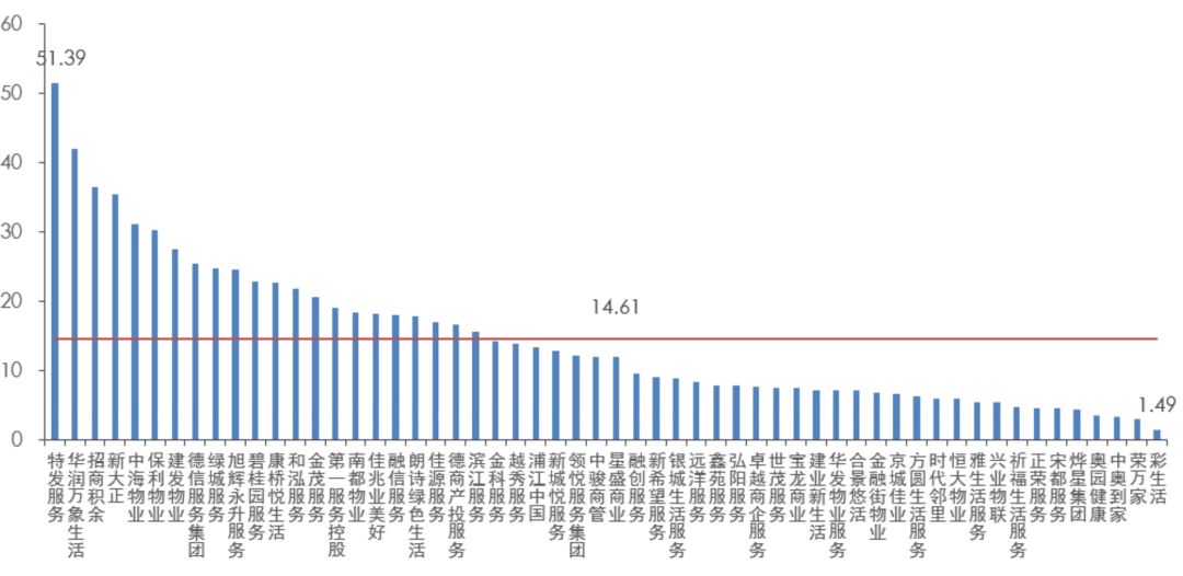 特發(fā)服務(wù)、華潤萬象生活和招商積余三家市盈率最高,分別為51.39倍、41.92倍和36.49倍。特發(fā)服務(wù)與華潤萬象生活市盈率也是少有的超過40倍的上市物企。