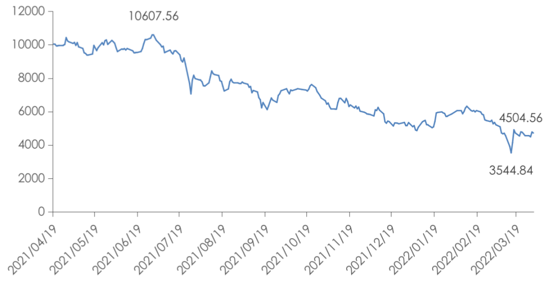 進入2022年,恒生物業(yè)服務(wù)及管理指數(shù)也一直呈現(xiàn)波動下滑態(tài)勢,并于2022年3月15日降至最低點3544.84點,相較最高點(2021年6月30日)10607.56點下降66.58%,至3月底,恒生物業(yè)服務(wù)及管理指數(shù)達4504.56點。
