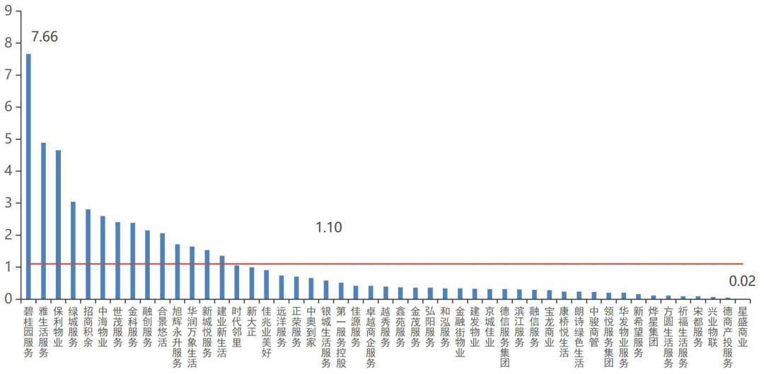 2021年披露年度在管面積的49家上市物企中,在管規(guī)模超過億平方米量級的物企達16家,超過均值(1.10億平方米)的物企為14家。其中,碧桂園服務(wù)在管面積達7.66億平方米,躍居上市物企在管規(guī)模之首;雅生活服務(wù)、保利物業(yè)和綠城服務(wù)在管面積均超過3億平方米;在管面積前五的企業(yè)規(guī)模總值達23.05億平方米,在上市物企中總規(guī)模占比超四成,上市物企的分化日益加大。