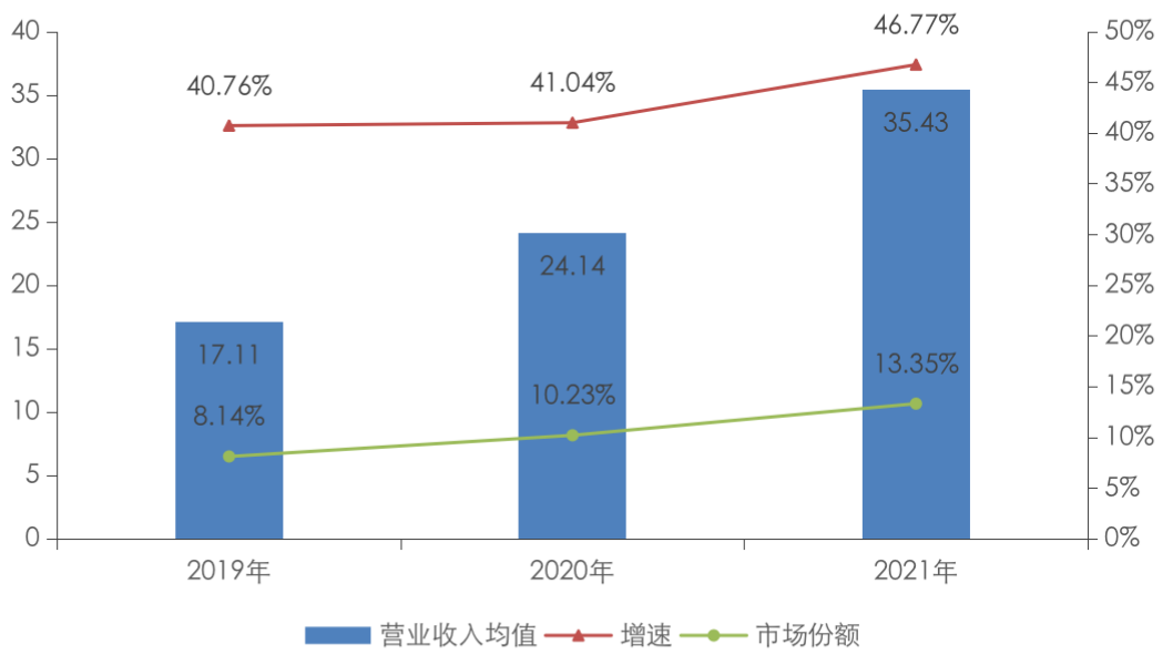 隨著物業(yè)管理規(guī)模的擴大和服務(wù)的多元化,物企經(jīng)營業(yè)績持續(xù)高質(zhì)量發(fā)展,多家物企表現(xiàn)亮眼,營業(yè)收入實現(xiàn)跨越式增長。50家上市物企營業(yè)收入總值由2019年的855.67億元增長至1771.28億元,均值由17.11億元增至35.43億元,復(fù)合增長率達43.88%。上市物企營業(yè)收入的市場集中度持續(xù)提升,2019年至2021年,50家上市物企在行業(yè)中的市場份額由8.14%增長至約13.35%。