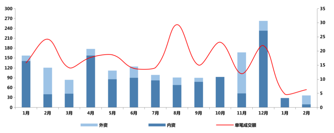 克而瑞CAIC AI監(jiān)測顯示,2021年1-2月,中國內地大宗物業(yè)共成交12筆,交易總額約 67億元,同比降幅76.3%;平均單筆成交額約5.6億元,同比下降69.9%,降幅顯著。