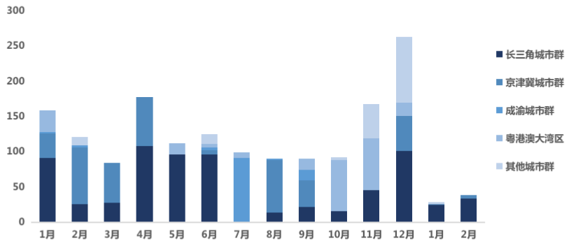 內地大宗成交物業(yè)城市群分布(成交金額,2020.01-2021.02)