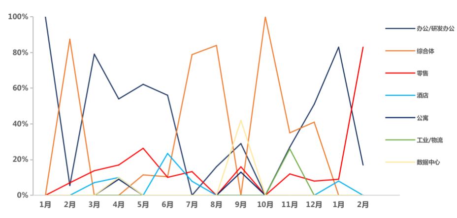 一線城市新興商務區(qū)的優(yōu)質寫字樓以及運營表現(xiàn)優(yōu)異、回報穩(wěn)定的商業(yè)資產受到資本青睞。1月,辦公/研發(fā)辦公業(yè)態(tài)成交占比超80%,為絕對主力;2月,受上海商業(yè)成交占比提升影響,一線城市整體商業(yè)占比大幅提升,為近一年來最高值。