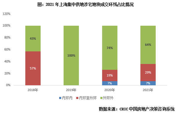 從2021年整體涉宅用地成交環線分布來推斷2022年新增供應區域結構,可以看出,涉宅用地外環以內成交占比已攀升至36%;其中內環至外環的占比由2020年的19%上升了10個百分點至2021年的29%,市中心內環內涉宅用地保持稀缺,2021年占比僅為7%,而外郊環、郊環外為主供場,成交活躍板塊多為五大新城、大虹橋區域。