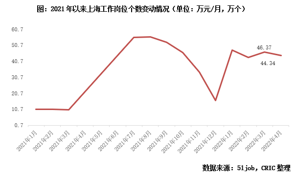 居民收入保持增長,但新增就業崗位減少:2022年一季度,上海市城鎮常住居民人均可支配收入23772元,增長5.0%。但一季度上海市新增就業崗位19.26萬個,比去年同期減少2.62萬個。從我們監測的上海51job數據來看也可論證以上觀點,工作崗位招聘量由3月的46.37萬個降至4月的44.34萬個,工資水平保持小幅微增狀態,4月平均工資為1.03萬元.