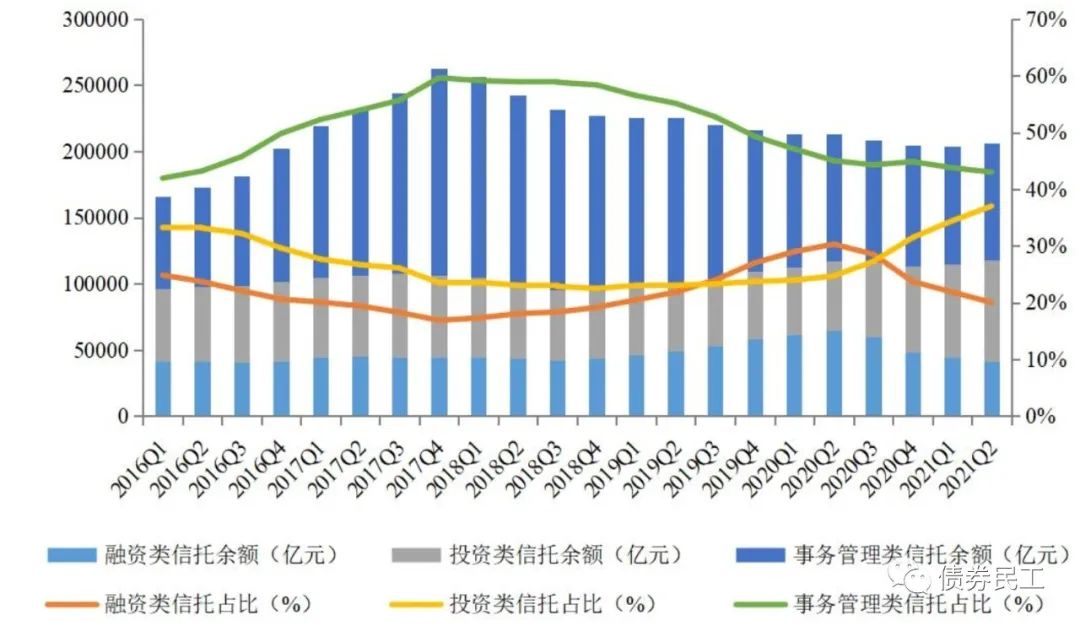 信托資產(chǎn)按照功能分類來看,融資類信托的余額和占比在2020年2季度末達到最高峰,此后持續(xù)呈現(xiàn)下降趨勢。2021年2季度末,融資類信托余額為4.13萬億元,相比2021年1季度末的4.45萬億下降了0.32萬億元,降幅為7.19%;相比2020年2季度末的6.45萬億下降了2.32萬億元,降幅高達35.97%!這個降幅不可謂不高,在實踐中大大降低了信托產(chǎn)品的融資功能。