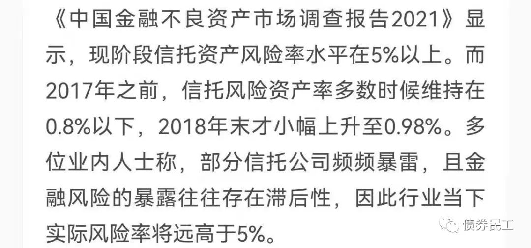 不只是融資類信托產(chǎn)品的規(guī)模在下降,信托資產(chǎn)風險率水平也在提高。根據(jù)《中國金融不良資產(chǎn)市場調(diào)查情況報告》的統(tǒng)計數(shù)據(jù),2017年之前信托資產(chǎn)風險率維持在0.8%以內(nèi),但是現(xiàn)在信托行業(yè)的實際風險率將遠高于5%。
