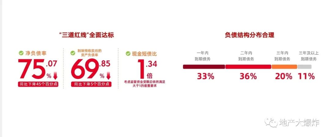 依照“三道紅線”融資新規(guī),金科股份剔除預收款后的資產(chǎn)負債率69.85%,同比降低5個百分點;凈負債率75.07%,同比降低45個百分點;現(xiàn)金短債比1.34倍,這也意味著金科股份“三道紅線”已全部轉綠,躋身“三好學生”陣營。