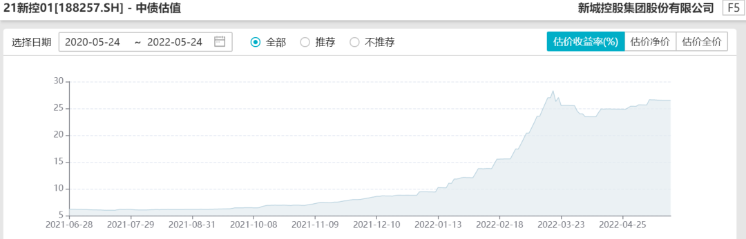 直到新城控股這單CRMW的橫空出世,標的主體新城控股是典型的困境發行人,本輪民營地產風險爆發以來,新城控股也是一直處在風口浪尖上,雖然沒有像花樣年和融創那樣完全躺平,但是其估值已經是扶搖直上,1年期到期收益率目前超過了26%的水平。