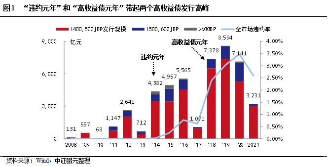 “違約元年”和“高收益?zhèn)辍睅韮蓚€高收益?zhèn)l(fā)行規(guī)模高峰