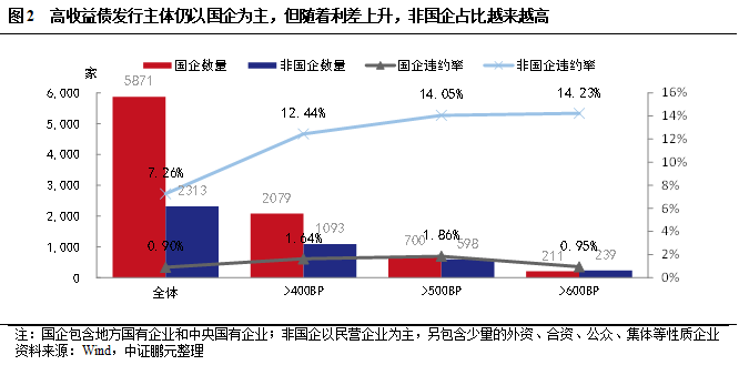 從不同利差主體的企業(yè)性質(zhì)分布來看,一級市場高收益?zhèn)陌l(fā)行主體以國企為主,但隨著利差上升,非國企占比越來越高(圖2)。利差>400BP的發(fā)行人中,國企占比為65%,非國企占比為35%,國企占據(jù)三分之二的高收益?zhèn)袌觯话l(fā)行利差進(jìn)一步上升后,國企的數(shù)量迅速縮小,占比越來越低,非國企占比則越來越高:利差>500BP的發(fā)行人中,國企占比54%,非國企占比46%,到利差>600BP時,國企占比降至47%,而非國企占比上升至53%,國企和非國企基本各占據(jù)半壁江山,甚至非國企占比還略超國企占比。但整體上,目前我國高收益?zhèn)袌龅陌l(fā)行主體仍以國企為主,非國企尚未占據(jù)主要高收益?zhèn)袌觥?/p>