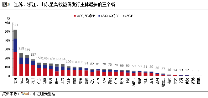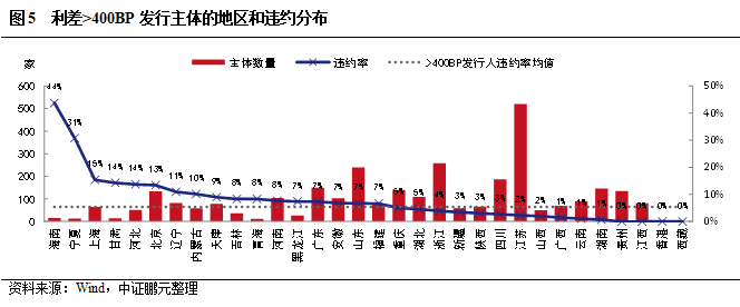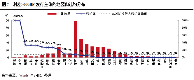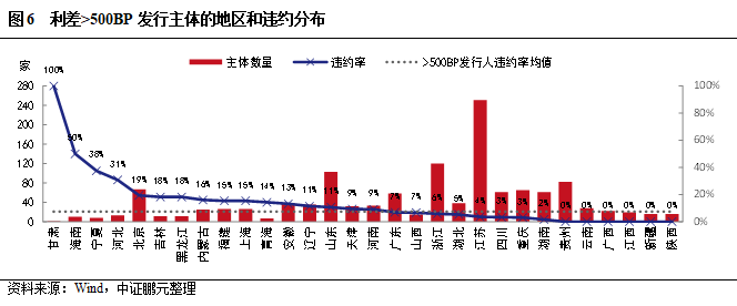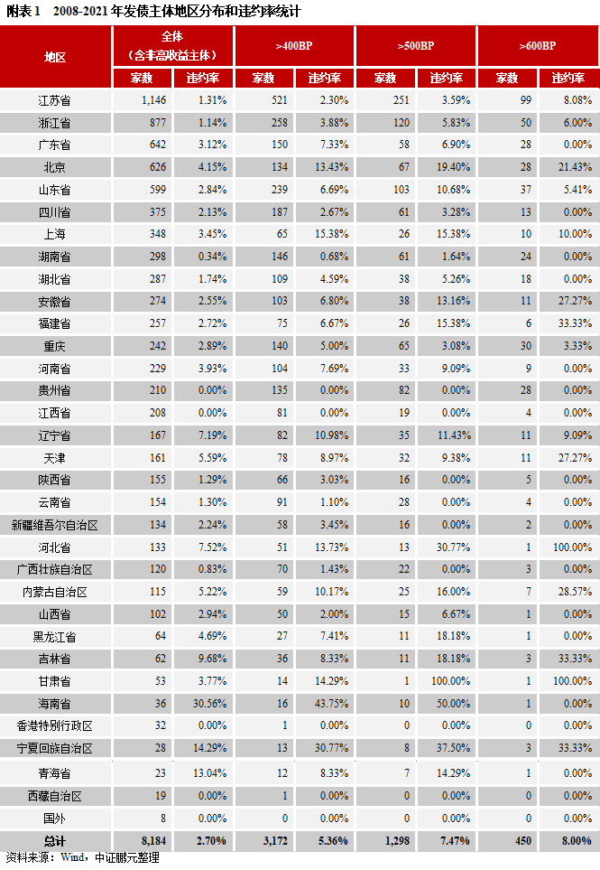 我們再來看一下高收益?zhèn)l(fā)行主體在各地區(qū)的分布和違約特征。從絕對數(shù)量來看(圖3),江蘇是高收益?zhèn)黧w的絕對大省,主體數(shù)量高達(dá)521家,是第二名的兩倍之多,占整體高收益?zhèn)黧w的16.4%;其次是浙江和山東,均在200家以上。在利差>400BP(圖5)、>500BP(圖6)、>600BP(圖7)三組高收益主體中,江蘇、浙江、山東均是排名前三。重慶以140家躍居第七名,其它網(wǎng)紅地區(qū)如貴州、云南、天津則分別以135家、91家、78家分居第八、十三、十六位。