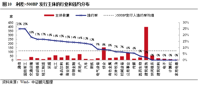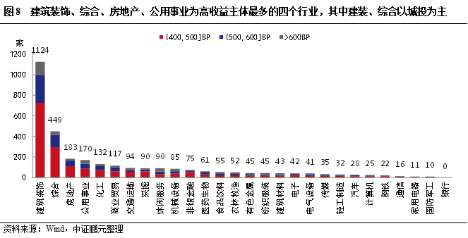 行業(yè)分布和違約特征方面,從統(tǒng)計數(shù)據(jù)來看,建筑裝飾是高收益主體數(shù)量最多的行業(yè),僅其一個行業(yè)就占全部高收益主體的35%;其次是綜合、房地產(chǎn)、公用事業(yè),也是一級市場高收益?zhèn)l(fā)行主體的主要分布行業(yè)(圖8)。前四個行業(yè)占全部高收益主體的60%。但建筑裝飾、綜合行業(yè)的高收益主體中有較大比例為城投,也就是說有相當(dāng)數(shù)量的弱資質(zhì)城投其發(fā)行利差還是偏高的。