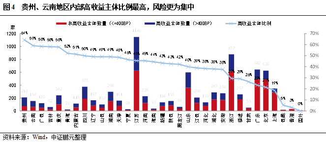 各地高收益主體絕對數(shù)量的高低,往往與該地區(qū)發(fā)債基數(shù)的大小相關(guān),而不能反映地區(qū)內(nèi)部風(fēng)險分化的情況。為進(jìn)一步觀察地區(qū)內(nèi)部風(fēng)險分化情況,我們統(tǒng)計了各地高收益主體占該地區(qū)全體發(fā)行人的比例(圖4)。我們觀察到與絕對數(shù)量分布截然不同的排序:貴州、云南兩大網(wǎng)紅高風(fēng)險地區(qū)的高收益主體比例分列第一和第二位,反映該地區(qū)內(nèi)高風(fēng)險主體比例較高,地區(qū)風(fēng)險更為集中;吉林、重慶、內(nèi)蒙古、遼寧、湖南、天津等常見高風(fēng)險地區(qū)也位居前列,而絕對數(shù)量較多的江蘇、山東則位居中游,浙江更是居后,反映其地區(qū)內(nèi)高風(fēng)險主體比例較低,地區(qū)風(fēng)險較為分散。