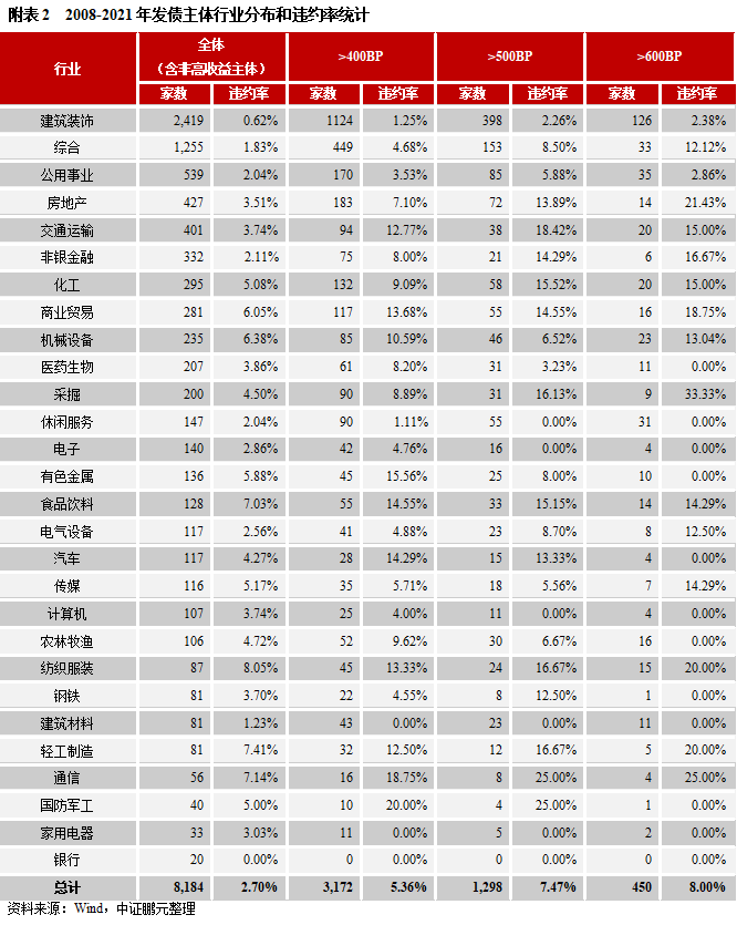 ①高收益主體違約率顯著高于全市場。2008-2021年全市場信用債發(fā)行人的總違約率為2.70%,而發(fā)行利差>400BP的發(fā)行人違約率為5.36%。