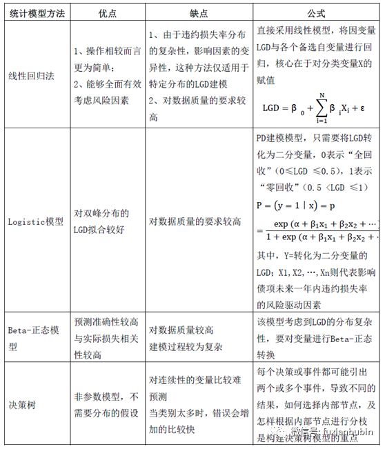 最后則是設計、建立統(tǒng)計模型,并給予實際業(yè)務經(jīng)驗對模型及其估值參數(shù)進行調(diào)整,進而彌補不完善的數(shù)據(jù),使模型的參數(shù)更加符合實際業(yè)務經(jīng)驗。最終通過LGD值與債項等級的映射,構(gòu)建債項評級體系。根據(jù)金融機構(gòu)的業(yè)務特色,金融機構(gòu)可結(jié)合各自的資源稟賦和各個統(tǒng)計模型的優(yōu)缺點,從中篩選適合自身的統(tǒng)計模型(統(tǒng)計模型方法如下表):