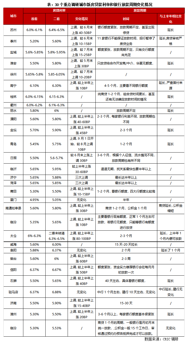 自年初央行推出房地產貸款集中度管理制度以來,各地“上行下效”,捂緊錢袋子,也出現了房貸額度緊張、放款周期拉長、貸款利率上調等現象。不過近期市場傳聞,下半年貨幣政策將向寬信用轉向,推動銀行加碼信貸投放,部分銀行已接到窗口指導加大8月末的信貸投放,如若傳聞屬實,勢必會帶動社會融資規??偭糠€步回升,對地產行業是否也存在一定的利好刺激?帶著這樣的疑問,我們于近期調研了30個重點城市的房貸利率和回款周期變動情況。
