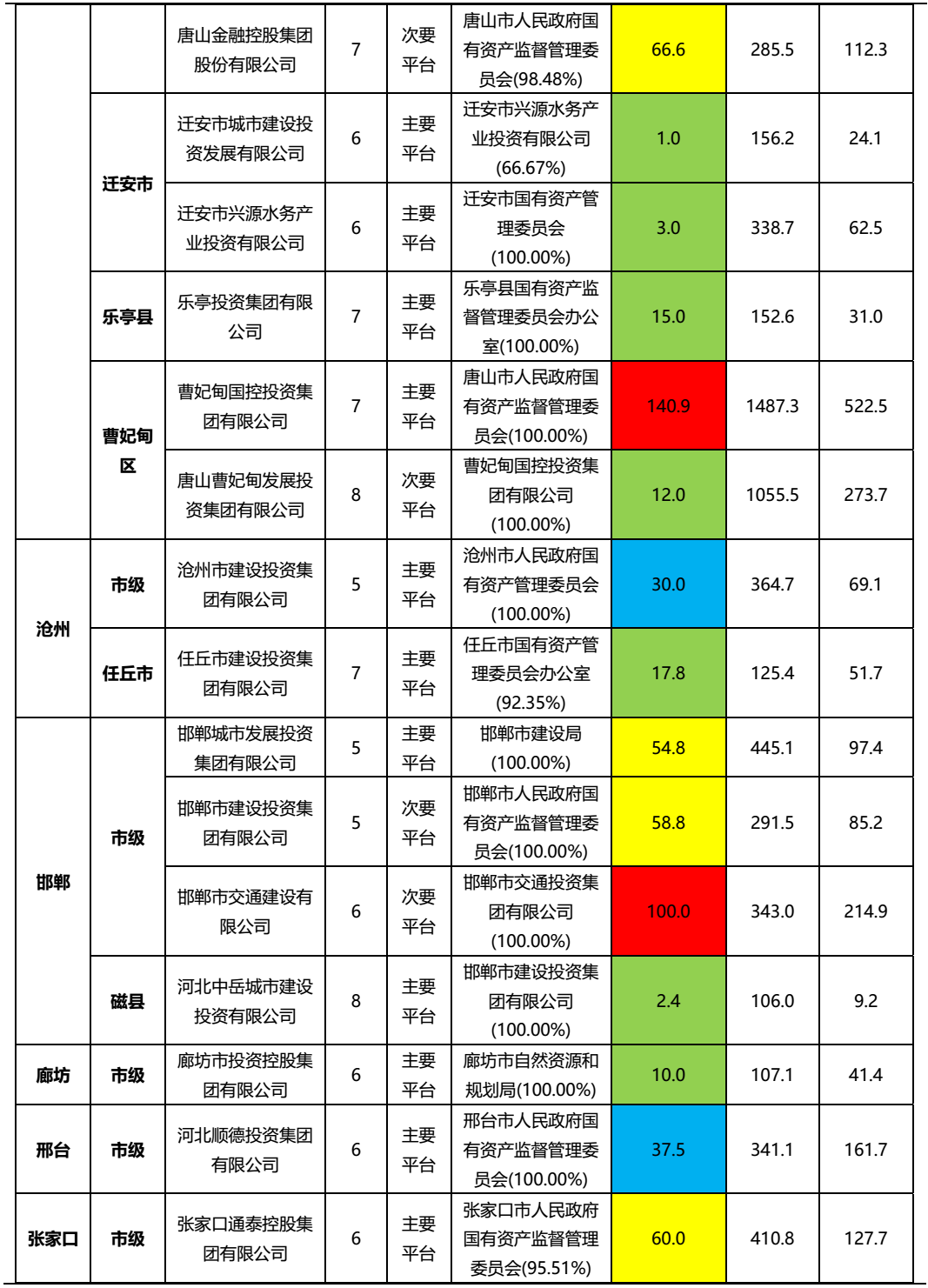 精簡是河北城投的一大主線,城投平臺數量較少、結構及分工清晰,單一平臺所能匹配的外部資源尚可,保證了當地主平臺資質的穩定。雖然有部分平臺債務負擔較重,但短債占比普遍不高,依托區域綁定和政府信仰,短期內出現問題的可能性不高。但需謹慎部分地區或平臺存在的非標占比偏高的問題。