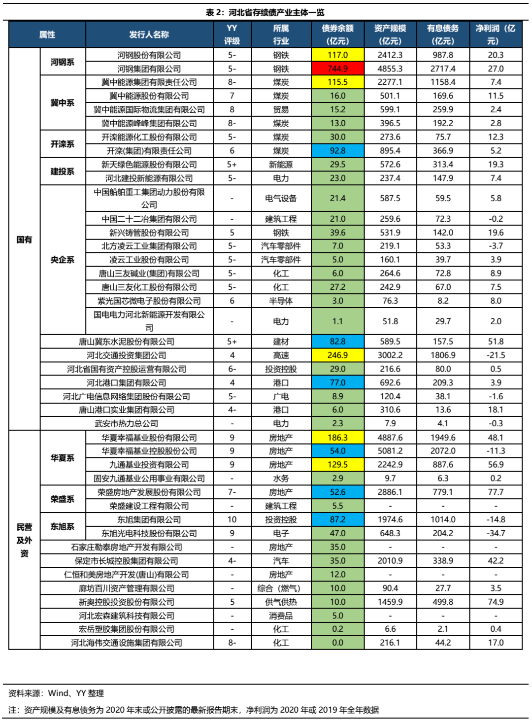 具體來看,河北省產業主體集團化、規?;@著。國企方面,河鋼集團、冀中能源、開灤集團、河北建投等幾大國有集團旗下均不止一個發債主體,占據了河北省產業債余額的半壁江山;民企方面,華夏幸福、榮盛地產、東旭集團占據省內民企產業債余額的8成(已有兩家集團先后違約)。