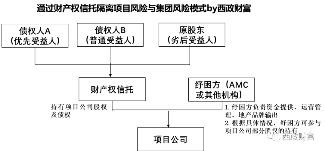 如何隔離項(xiàng)目本身的風(fēng)險(xiǎn)與集團(tuán)自身的風(fēng)險(xiǎn)系目前大多數(shù)踩雷的投資機(jī)構(gòu)關(guān)注的重點(diǎn)。當(dāng)下也有一些AMC通過與信托合作財(cái)產(chǎn)權(quán)信托的方式進(jìn)行相關(guān)風(fēng)險(xiǎn)隔離。