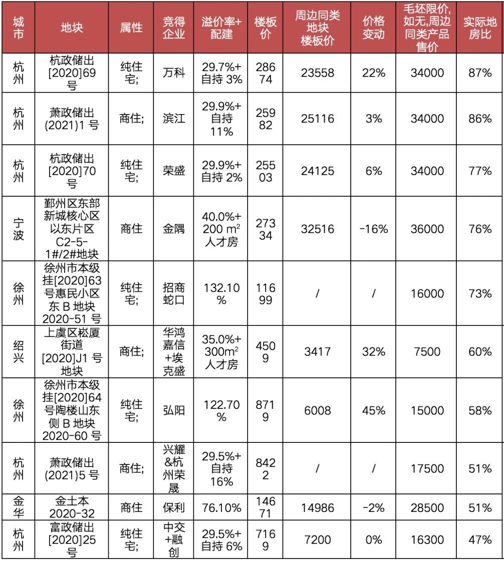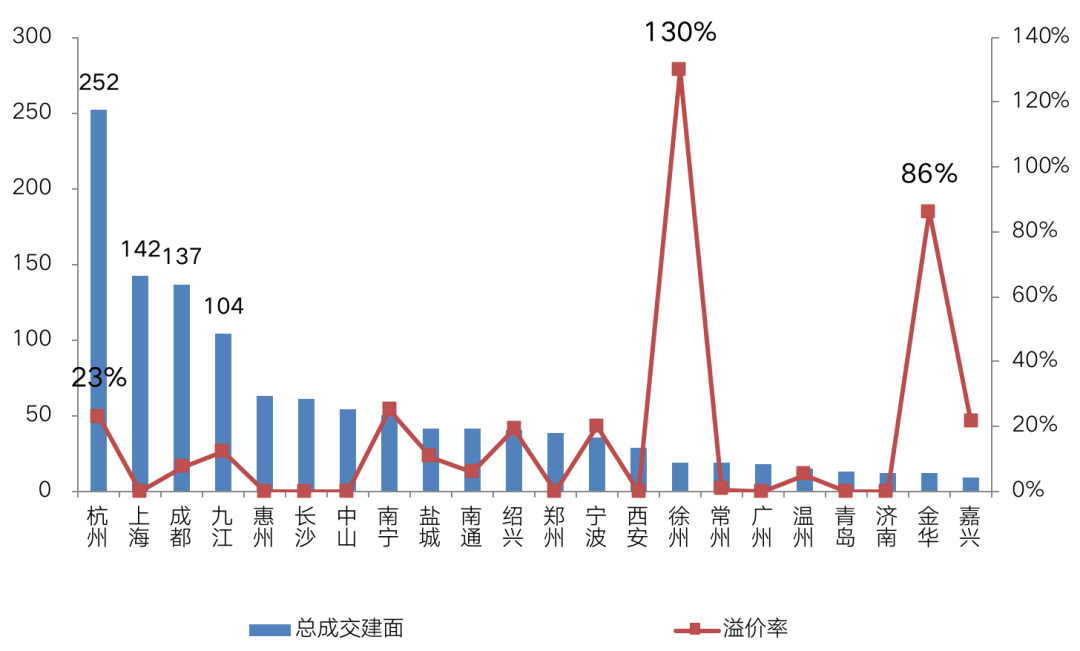 在優質土地的刺激之下,杭州、徐州、寧波、金華均有超高溢價地塊成交,最高限價成交的地塊也不在少數。