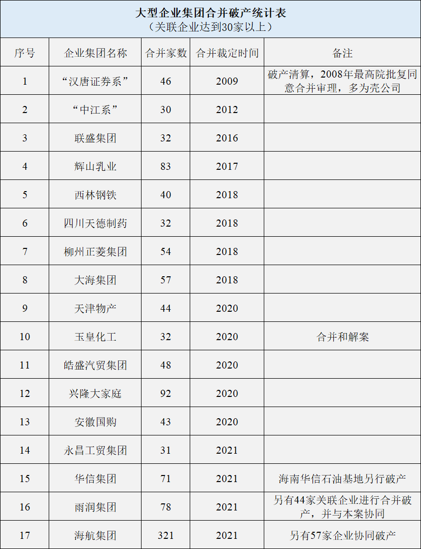 自實(shí)質(zhì)合并破產(chǎn)制度建立以來(lái),涉及企業(yè)規(guī)模越來(lái)越大,據(jù)筆者檢索,目前,關(guān)聯(lián)企業(yè)達(dá)到30家以上的有17起,具體數(shù)據(jù)如下: