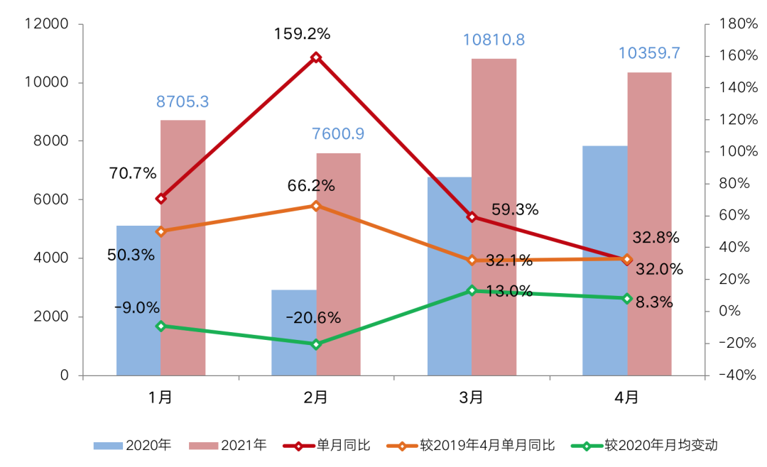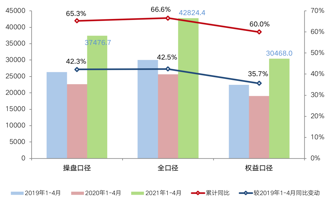 從前4月累計銷售操盤金額來看,1-4月,百強房企整體的業績規模同比增長65.3%,較2019年同期也增長近42.3%。1-4月百強房企全口徑銷售金額更是達到了42824.4億元,同比增長66.6%。
