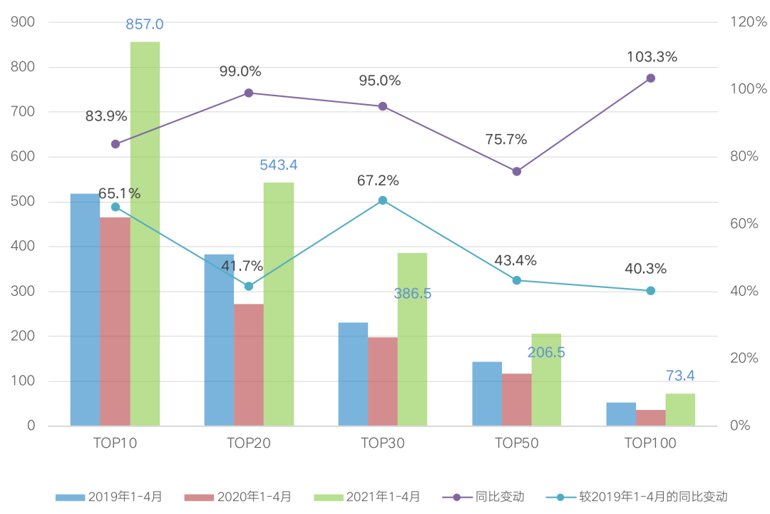 2021年1-4月,各梯隊房企銷售門檻繼續提升,相較去年和2019年同期均有明顯增幅。其中,TOP10房企銷售操盤金額門檻為857億元,較2019年同期增長65.1%,龍頭房企保持規模優勢。
