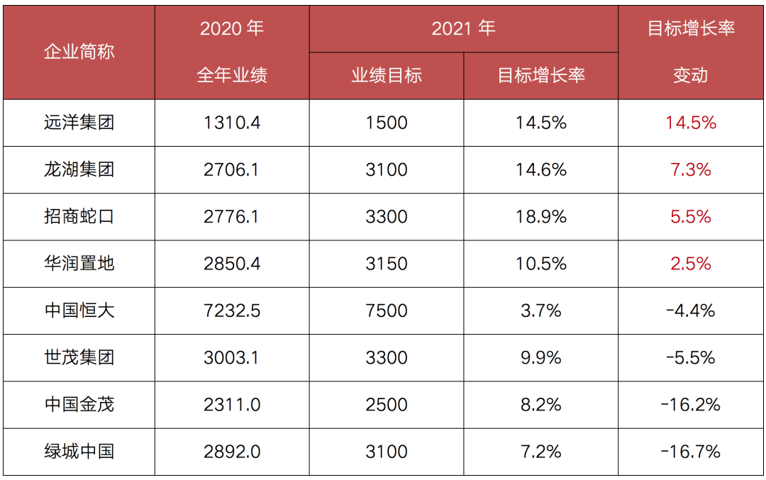 “房住不炒”長效機制下,調控收緊仍是主旋律,疊加“三道紅線”新規,在市場下行壓力下行業整體規模增速放緩,企業控負債、降杠桿壓力增加。預計隨著房企投資和規模擴張動能的降低,未來規模房企增速放緩將成為常態。規模房企的業績目標制定會更趨謹慎,整體的目標增長率也將趨于平穩。