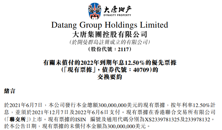 2022年5月23日,大唐集團控股發(fā)布公告,擬就旗下一筆美元債未償付本金額的至少2.7億美元或90%發(fā)起要約交換。