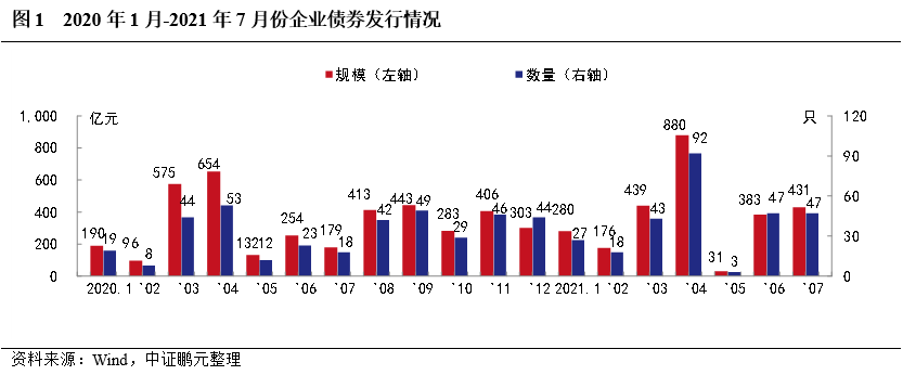2021年7月,企業債券發行47只,發行規模430.70億元,與上年同期相比分別增長161.1%和141.3%;與上月相比,發行數量持平,發行規模環比增長12.3%。