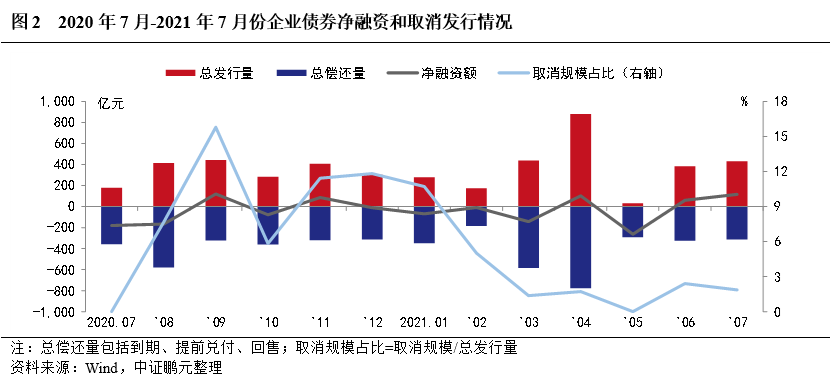 從凈融資情況來看,7月企業債券總發行規模430.70億元,總償還規模314.51億元,本月表現為凈發行116.19億元,上年同期為凈償還180.52億元。此外,2021年7月有1只企業債券取消發行,原計劃發行規模8億元。2021年1-7月份,企業債凈融資表現為凈償還207.89億元,較上年同期凈償還規模減少923.21億元。