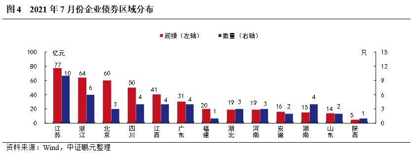 2021年7月,共有13個省份發行了企業債券。其中,江蘇省發行77.30億元,規模高于其他省份,其次,浙江省和北京分別發行64億元、60億元。從發行數量上看,江蘇省發行10只,浙江省發行6只,其他省份發行數量較少。與上年同期相比,7月發行省份較上年同期均出現增長,其中,四川省、江蘇省和北京發行規模同比增長300%以上,江蘇省增速287%,漲幅也較大。