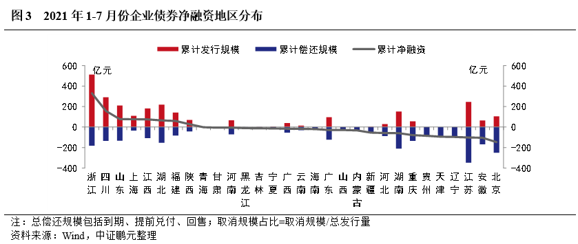 從地區分布看,2021年1-7月份企業債凈融資依然呈現兩極分化,多個經濟欠發達地區本年度尚未發行企業債。其中,浙江省實現凈融資330.13億元,遠高于其他省份,其次是四川省實現凈融資156.90億元,位居第二。而湖南省、江蘇省因償還規模較大,凈融資規模為負。青海、甘肅、黑龍江、海南、內蒙古、山西、貴州、天津和遼寧未發行企業債,其中,貴州、天津和遼寧的償還規模較大,分別為85.54億元、94.41億元和96.94億元。