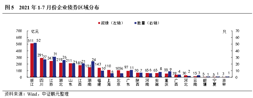綜合2021年1-7月份看,浙江省發行規模最大,累計511.40億元,發行數量52只;四川省發行291.40億元,位列第二;江蘇省、湖北省和山東省分別發行246.80億元、218.80億元和211.10億元,規模也相對較大。與上年同期相比,有10個省份的企業債發行規模同比增加,其中,浙江省同比增加289%,漲幅最大,其次是江西省和山東省分別增長132%和128%;共有7個省份的企業債發行規模同比下降,其中,云南省、陜西省和廣東省分別同比下降77%、61%和59%,降幅較大。此外,貴州、天津、山西、甘肅和海南省本年未發行。
