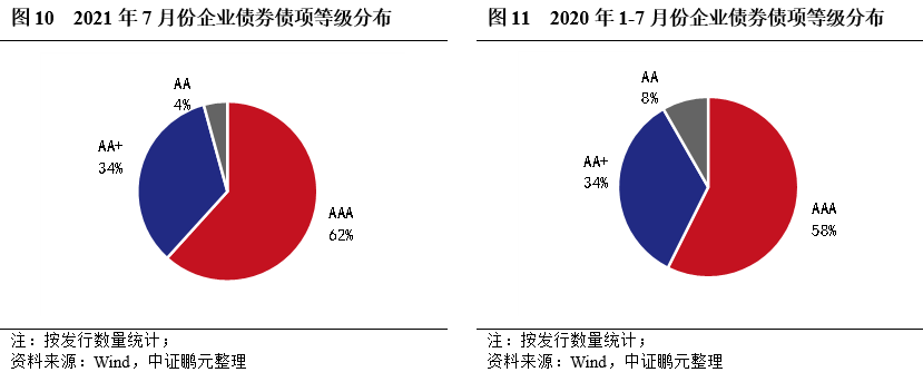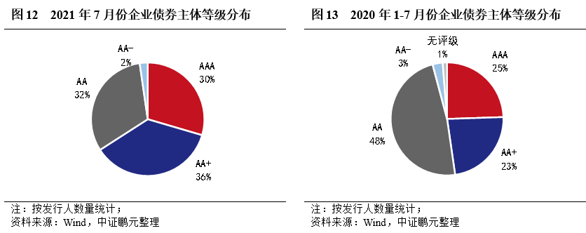 從發行主體等級看,7月AAA級主體13家,占比30%;AA+級主體16家,占比36%;AA級主體14家,占比32%,AA-級主體1家,占比2%。整體看,7月高等級企業債發行人數量占比66%,較上月提升30個百分點,與5月持平。綜合2021年1-7月看,AAA級主體占比25%,AA+級占比23%,AA+及以上占比較上年同期下降2.9個百分點。