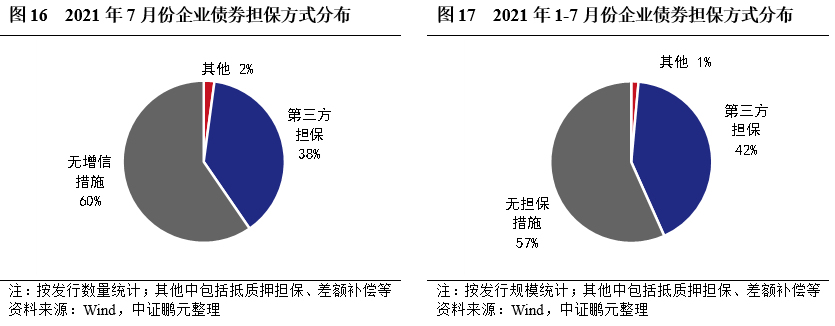 2021年7月,企業債有擔保的債券共計19只,數量占比40%,較上月下降4個百分點,主要是高級別主體數量增加。分主體級別看,AA級主體選擇增信發行的債券比重為87%,較上月上升15個百分點;AA+級主體選擇增信發行的債券比重為31%,上月均未選擇增信。綜合2021年1-7月看,有增信的債券占比43%,較上年同期增長6個百分點。從趨勢看,2021年有增信債券占比呈現波動下降,與發行主體結構有關。